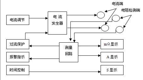 接地電阻測(cè)試儀是由測(cè)試電源、測(cè)試電路、指示器和報(bào)警電路組成。測(cè)試電源產(chǎn)生測(cè)量電流,測(cè)試電路將電流信號(hào)和流經(jīng)被測(cè)電阻上電流所產(chǎn)生的電壓信號(hào)進(jìn)行處理,完成交直流轉(zhuǎn)換,進(jìn)行除法運(yùn)算,指示器指示電流值和電阻值,若被測(cè)電阻大于報(bào)警值,儀器發(fā)出繼續(xù)的聲光報(bào)警,若測(cè)試電流大于30A,則發(fā)出連續(xù)的聲光報(bào)警,并切斷測(cè)試電流,以保證被測(cè)電器的安全。